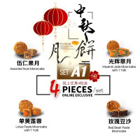 - Rewardz Set A1 : 单黄莲蓉 Lotus Paste Mooncake with 1 Yolk / 玫瑰豆沙 Red Bean Paste Mooncake / 伍仁果月 Assorted Nuts Mooncake / 光辉翠月 Imperial Jade Mooncake with 1 Yolk