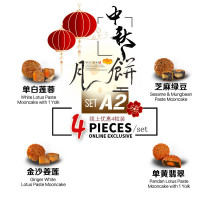 - Rewardz Set A2 : 单白莲蓉 White Lotus Paste Mooncake with 1 Yolk / 金沙姜莲 Ginger White Lotus Paste Mooncake / 单黄翡翠 Pandan Lotus Paste Mooncake with 1 Yolk / 芝麻绿豆 Sesame and Mungbean Paste Mooncake