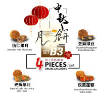 Rewardz Set B3 : 伍仁果月 Assorted Nuts Mooncake / 芝麻绿豆 Sesame and Mungbean Paste Mooncake / 双黄莲蓉 Lotus Paste Mooncake with 2 Yolks / 光辉翠月 Imperial Jade Mooncake with 1 Yolk